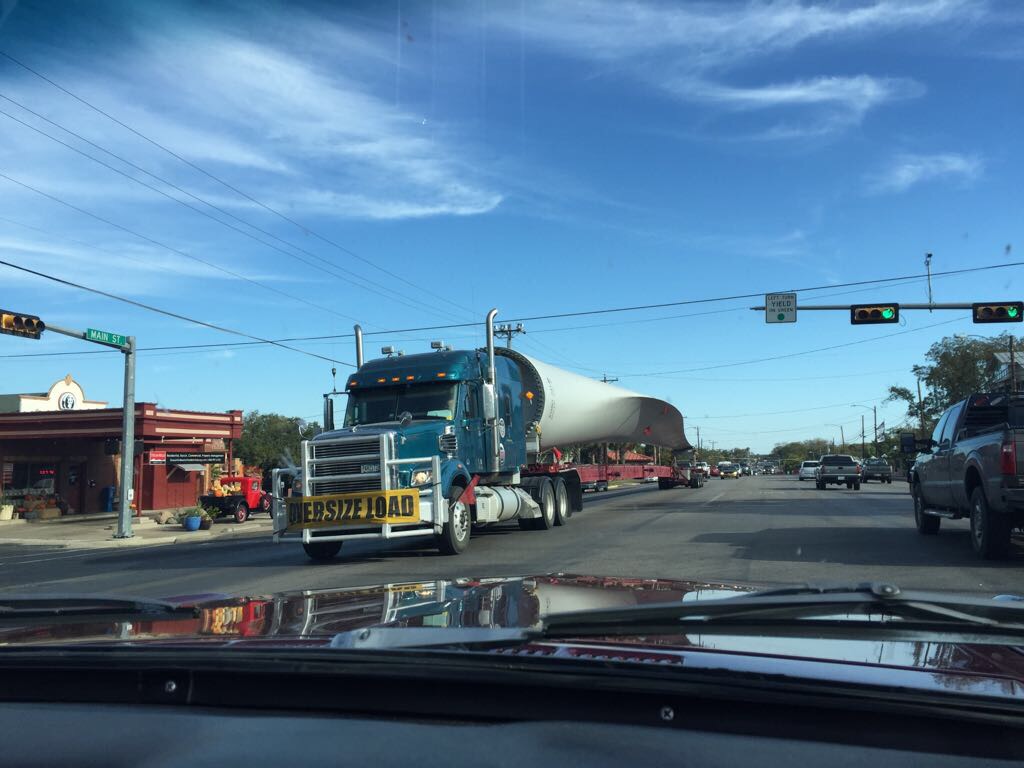 Oversized load truck carrying a windmill wing through Fredericksburg Main Street